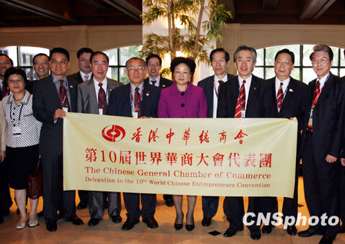 十一月二十日,前来菲律宾出席“第十届世界华商大会”的香港中华总商会成员与国侨办主任李海峰(右四)合影。当日,在马尼拉国际会议中心进行的华商大会正式开幕。此届大会以“加强华商联系,促进世界繁荣”为主题。中新社发 洪少葵 摄