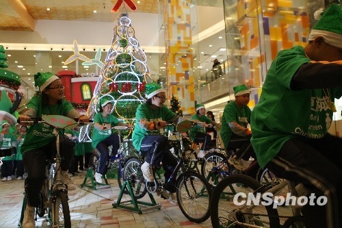 十一月二十三日,百名香港学生一同踩单车,为点亮在香港东港城一楼展览城开幕的“爱-绿圣诞”活动圣诞树树灯发电。位于香港将军澳的东港城商厦,在圣诞节期间引入新式室内太阳能发电装置,吸收室内光转化成电力,以期达到:减废、重用、代用、回收资源。中新社发 郑祚声 摄