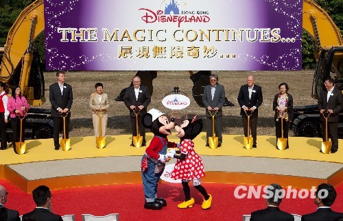香港迪斯尼乐园度假区十二月十三日举行动工仪式,开展扩建工程。香港特别行政区政府财政司司长曾俊华(右四)、商务及经济发展局局长刘吴惠兰(左三)和华特迪斯尼乐园及度假区主席罗思乐(右三)、行政总裁金民豪(右一)在政府、华特迪斯尼公司和香港社区的代表见证下,主持了典礼。中新社发 魏扬 摄