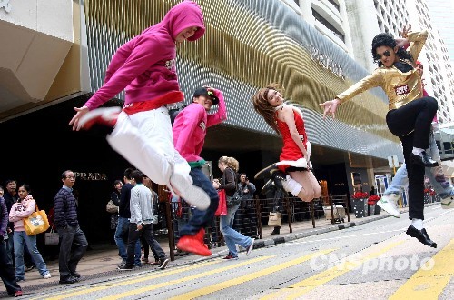 12月17日,一班舞蹈演员与“迈克杰克逊”扮演者在香港广东道街头狂乐起舞,为圣诞节平安夜倒数派对热身。中新社发 洪少葵 摄