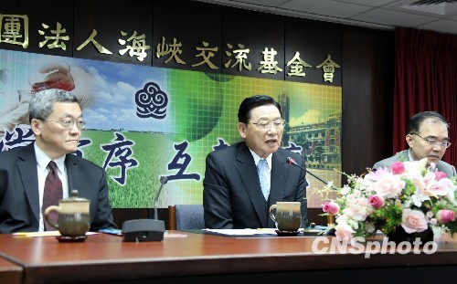 十二月十七日,台湾海基会举行第四次“陈江会谈”行前记者会,海基会董事长江丙坤介绍两会协商议题,并回答记者提问。中新社发 曾嘉 摄