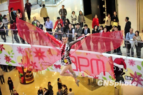 世界著名俄罗斯空中飞人Stefka Iordanova,二十三日在香港创纪之城商场表演头发绑着绞盘,悬空中转圈、玩呼拉圈及杂耍,场景刺激引人注目。中新社发 谭达明 摄