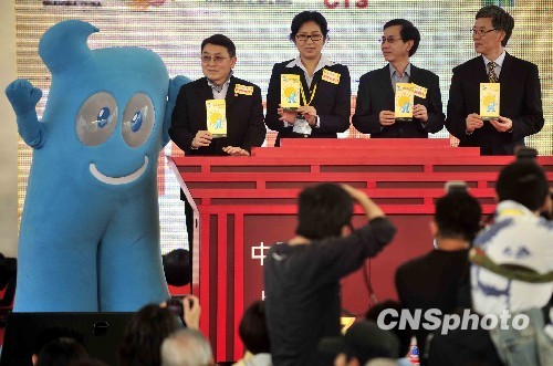 为宣传香港参与二○一○年上海世博会,香港特区政府二十五日在维园举行“世博同乐日”。 (左起)香港中华厂商联合会会长尹德胜、上海世博局票务中心副主任赵蕾、香港政制及内地事务局世博事务统筹主任吴汉荣及香港中旅董事总经理周来卫,主持“世博同乐日”开幕仪式。中新社发 谭达明 摄