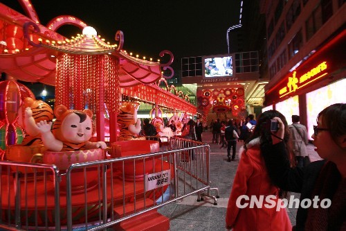 1月27日晚,香港维多利亚港,各种造型的小老虎纷纷亮相,大红的灯笼也高高挂起,引得路人争相合影留念,随着中国传统春节的来临,香港过节气氛越来越浓。中新社发 王中举 摄