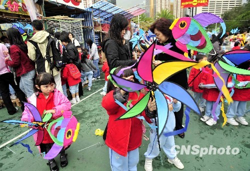 香港最大型的维园年宵市场8日开锣。图为鱼型的风车吸引幼童购买。中新社发 谭达明 摄