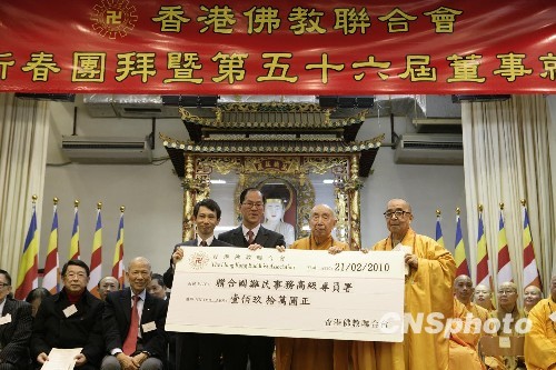 2月21日,香港佛教联合会“庚寅年新春团拜暨第五十六届董事就职典礼”在香港佛教联合会文化中心举行。香港特区民政事务局局长曾德成为该会董事及顾问颁发选任及聘任书,并主持监誓仪式。图为觉光法师代表佛联会向海地地震灾民捐款。