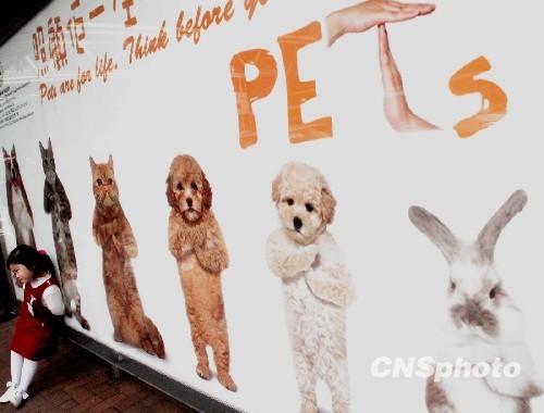 2月下旬,香港街头展示醒目的宣传爱护关爱动物大型户外广告,其动物可爱的形象吸引路人的视线,图为一位小朋友与广告合影留念。中新社发 张勤 摄
