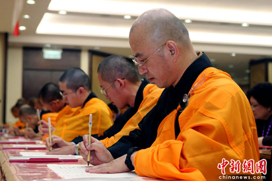 4月11日下午,来自十方的千多位佛教信众,在香港佛光山道场参加“百万心经入法身”千人抄经修练活动。位于九龙湾宏光道的香港佛光山道场,当日上午,举行了道场落成暨佛像开光大典。 中新社发 郑祚声 摄
