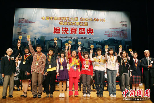 4月12日,“为了美好的明天‘2009-2010中国中学生作文大赛全国决赛’颁奖典礼”在香港荃湾大会堂举行。该大赛于去年7月启动,共吸引了内地及港、澳3000多万名学生参与。经各赛区预赛,推选出的200名内地及港、澳“文学之星”齐聚香港进行一连4天笔试、面试、口试,产生初中组、高中组合共138名一等奖“文学之星”(其中20位再获恒源祥文学之星殊荣)。