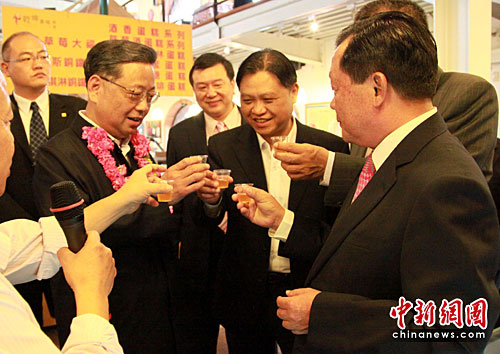 5月6日,率团访台的福建省长黄小晶(左一)在台湾苗栗县大湖酒庄与苗栗县长刘政鸿等一道把酒话合作,品尝当地生产的草莓酒。当天,黄小晶率福建经贸文化交流团考察了苗栗县大湖酒庄。中新社发 罗钦文 摄