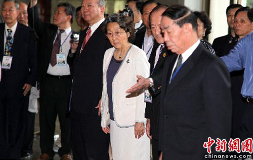 5月11日下午,出席“中山·黄埔·两岸情”论坛的全体人员在台北向孙中山先生铜像三鞠躬,并献上鲜花表示致敬。图为黄埔军校政治部主任(早期)周恩来侄女、黄埔4期生周恩寿之女周秉德(着白色裙装者)参加致敬仪式。中新社发 董会峰 摄