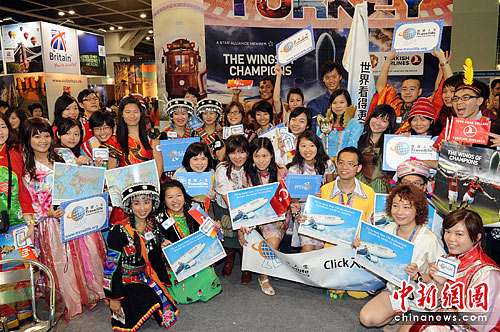 6月12日,10日开幕一连4天的在香港会展中心举行的“第24届香港国际旅游展及第5届商务会奖旅游展”迎来首个公众开放日。香港许多爱好自由行的“背包族”,身着各国名民族服饰在“旅游展”现场与各国工作人员热络出镜。中新社发 郑祚声 摄