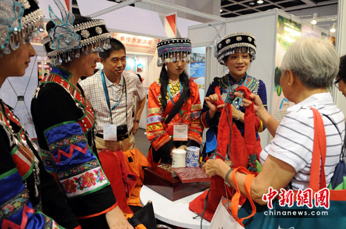 6月12日,香港国际旅游展展出的云南民族服饰令观众爱不释手。位于中国西南边陲的云南省风光秀丽,更因境内多民族聚居拥有丰富多彩的人文景观而成旅游者的“天堂”。中新社发 郑祚声 摄