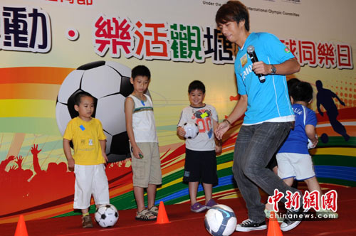 南非足球世界杯开赛,香港各界“足球热”高烧不止。6月13日下午,“中银香港第53届体育节足球同乐日”在观塘举行。图为应邀参加活动的香港甲组杰志足球队球员,在与小朋友们“过招”。中新社发 郑祚声 摄