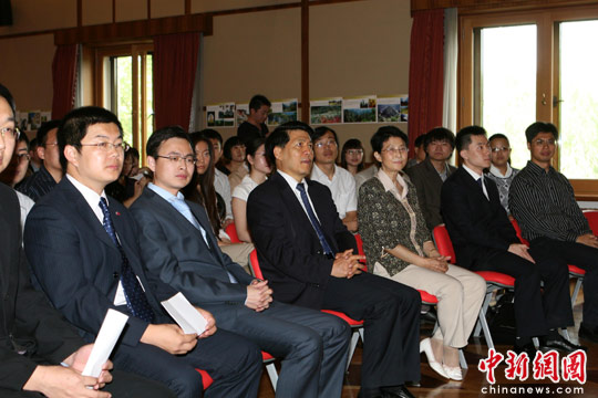 6月13日,中国留俄博士生联谊会成立大会在中国驻俄罗斯大使馆举行,中国驻俄李辉大使(左三)、使馆教育处裴玉芳公参(左四)出席。中新社发 田冰 摄