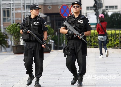 9月9日,特警在北京长安街东单路口站岗值勤。随着国庆临近,北京长安街警力加强。中新社发 郑雄增 摄
