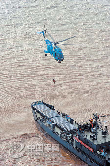 12月18日,一场海上联合搜救演练在东南某海域举行。由直升机和舰艇组成的空中、海上应急救护队完成了紧急出动、海空搜救、机上救护、直升机运送伤员等演练课目。图为直升机上的救援人员将“伤员”吊上机舱。 贲道春摄