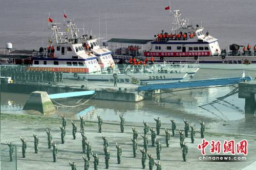 4月29日上午7时,海警33041艇驶离码头开赴上海海域。当日,浙江公安边防总队增援上海的4艘舰艇顺利集结,启程赴上海参加世博会安保工作。世博会期间,浙江公安边防总队共有6艘舰艇增援上海,此前有2艘艇先期抵达。6艘舰艇主要担负着海上警戒、海上船只查控及重点部位管控等任务。中新社发 梁丰 摄