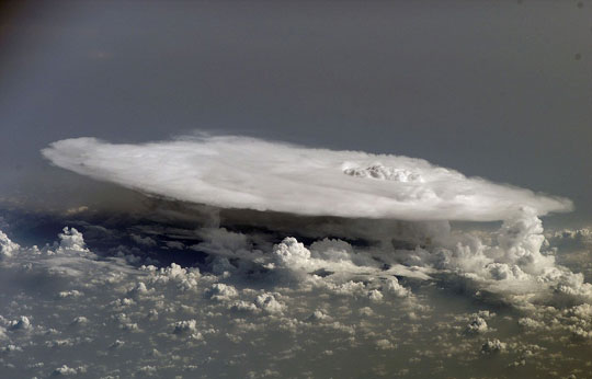 据英国媒体29日报道,近日,国际空间站的宇航员拍摄到了一个奇异的景观:一个圆盘状的巨型云团正翻腾着向地球大气层靠近,隐现于非洲西部上空。