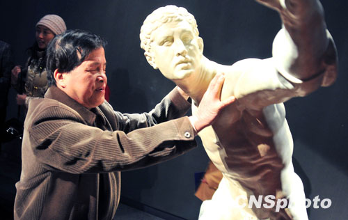 11月20日,《触·觉——法国卢浮宫触摸雕塑艺术特展》在福建博物院展出,其最大特点是可以触摸,打破传统参观模式,不仅视障人群可用手感知艺术之美,也为普通参观者提供了新的艺术体验方式,与展品零距离接触。本次参展24件雕塑品,18件来自法国卢浮宫,为公元前2世纪至19世纪西方经典雕塑复制品;6件来自福建当代艺术家的佳作。图为盲人正在感知2世纪的作品“奋力”。中新社发 张丽君 摄