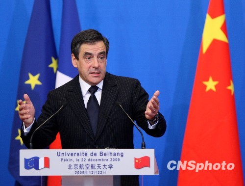 12月22日上午,在中国访问的法国总理菲永到北京航空航天大学发表演讲。中新社发 任晨鸣 摄