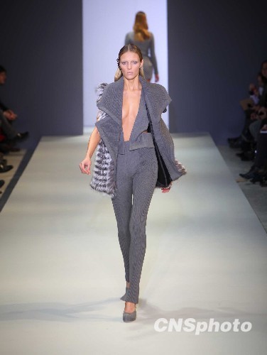 当地时间2月19日,2010年伦敦时装周揭幕。图为模特在展示英国著名年轻设计师Hakaan的作品。他的设计以简约、注重剪裁著称。中新社发 勇智毅 摄