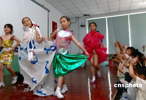 6月2日,辽宁省锦州市凌河区育英小学迎世界环境日开展“儿童时装秀警示禁塑”活动,小学生自己动手设计一件由废弃塑料制作的“时装”,并亲自进行时装表演,警示人们自觉禁塑,保护环境,从小树立环保意识。中新社发 李铁成 摄