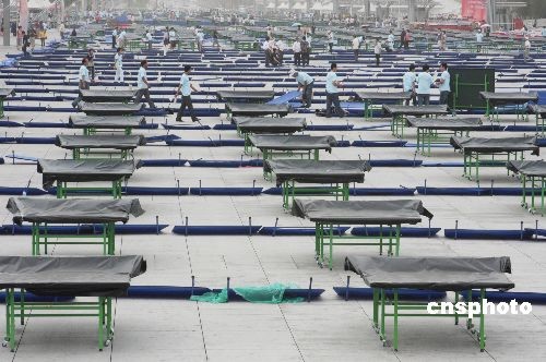 6月19日,北京国家体育场“鸟巢”前景观大道,工人在摆放1000台乒乓球桌,迎接北京市第七届全民健身节开幕。届时,将有乒乓球世界冠军、国际友人、大中小学生等上万人参与,他们将在上千台乒乓球桌上进行乒乓球展示。中新社发 吴芒子 摄