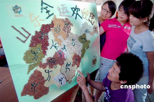 6月22日,为迎接第十一届全运会,山东聊城大学生命科学学院生物践行者协会的5名大学生以山东省地图为模板,利用黄瓜、香菜、绿豆、大米等12种种子为素材,制作成全运会地图。地图上用黑米拼出了山东每个城市所承办比赛项目的标志,并用红、黄、黑、白四色种子拼写了“山东全运欢迎您”的标语。中新社发 张振祥 摄