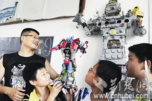 科幻片《变形金刚2》刚刚在武汉上映,就掀起一股“变形金刚”热。记者昨日(24日)在武汉市59中看到,会议室摆满机器人模型,最小的仅巴掌大小,最大的近一人高。该校美术老师邹华章介绍,这些都是他和同学们用各种废品制作的,其中一个“大黄蜂”模型已被武汉展览馆选中,准备公开展出。(张欣)