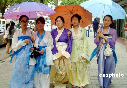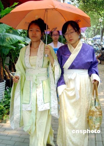 2009年7月3日,几名大学生身穿汉服行走在古城苏州街头,成为一道靓丽风景线,吸引了不少游人和市民的目光。据悉,这几名大学生利用暑假,向市民宣传汉服,展示汉服风采,从而让更多的人认识汉服文化的内涵。中新社发 王建康 摄
