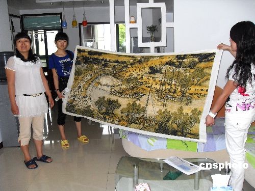 2009年7月2日,浙江温岭箬横镇的祁女士展示自己用了近两年的时间完成的十字绣作品《清明上河图》拱桥段。据悉,这幅长2米、宽1米的《清明上河图》共绣了三十六万一千多针,使用了三十七种配色。中新社发 金云国 摄