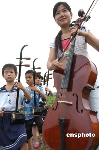 2009年7月6日,一曲《在希望的田野上》的乐曲飘荡在河南新蔡栎城乡六里棚村的田野上。当日,六里棚中村小学的留守儿童们在田野上拉练二胡曲,碧绿丰实的田野成为这些孩娃们快乐消夏的乡村音乐“会所”。中新社发 赵学风 摄