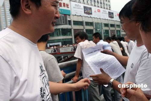 7月8日,乌鲁木齐市中山路天桥上,市民正在观看散发的传单。中新社发 刘新 摄