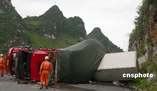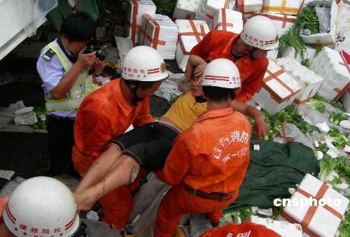 7月24日上午8时许,广西百色市田东县步兵乡往德保方向公路,一辆满载蔬菜的大货车和一辆载有鲜鱼的小货车相撞,小货车车头竟被大货车车厢“吞噬”,车内两人受伤被困。当地消防人员闻讯赶至现场将被困人员救出。中新社发 杨荣超 摄