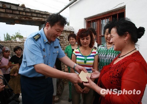 “八一”前夕,空军政治部群工局周强局长代表空军官兵,把春蕾计划捐款送到新疆伊犁维吾尔大二学生艾米旦妈妈的手中。从1995年起,空军实施了“蓝天春蕾计划”,开展了“爱心献春蕾”系列活动。15年间,空军部队累计捐款2200万元,在新疆、西藏等23个省市自治区开办111个“蓝天春蕾女童班”,援建8所“蓝天春蕾学校”。中新社发 谭超 摄