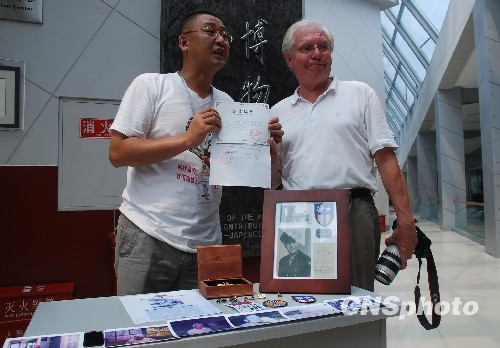 8月15日,援华美军飞行员老兵乔治·朗德利·简森的儿子乔治·里查德·简森(图右)来到位于成都大邑县的建川博物馆,向该馆馆长樊建川(图左)捐赠了一批珍贵的抗战文物。中新社发 志维 摄