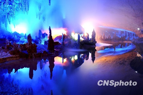 广西漠川观音洞经过三年多的开发,最近开始迎接四方来客。观音洞座落在距兴安县城28公里的钓鱼山下,依傍着秀丽的漠川河,洞内石柱、石幔、石花多姿多彩,古生物化石堪称稀见,神秘的石壁天书蕴藏玄机。游人在洞中可领略大自然的韵味。中新社发 李应国 摄