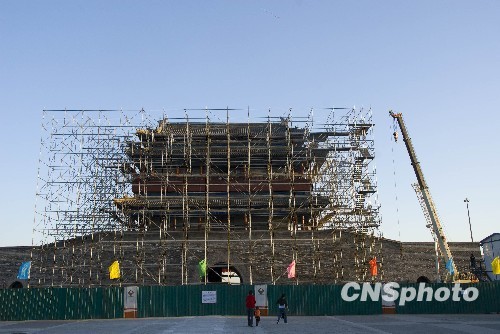 9月中旬,北京永定门城楼安装脚手架,加装灯光设备,为迎接国庆六十年大庆做准备。中新社发 草木 摄