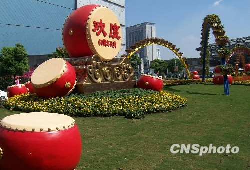 9月19日,一组用大红锣鼓雕塑与花卉组合的立体花坛扮靓上海五角场环岛绿地,为新中国60华诞增添了喜庆的氛围。中新社发 周东潮 摄