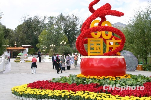 今年十月一日将迎来新中国成立六十周年,西藏自治区拉萨市著名的世界文化遗产罗布林卡公园前已经摆放起鲜花布景,迎接国庆。中新社发 徐长安 摄