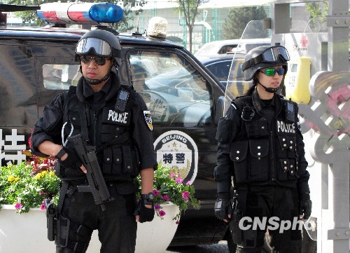北京市公安局特警总队的特警队员近日在北京天安门广场附近执勤。随着国庆节的日益临近,北京市公安局已启动街头和重点地区一级加强巡逻防控方案,并在繁华和重点地区部署武装巡逻车、刑侦便衣警力等。进一步严打现行犯罪,加大违法犯罪活动的打击力度,为新中国成立60周年庆祝活动创造良好的社会治安秩序。中新社发 杨萍 摄