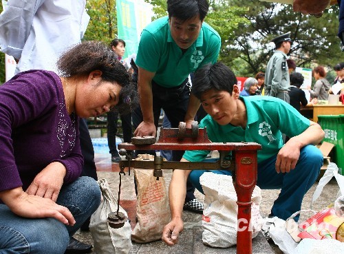 9月26日,北京松榆里社区的居民将家中积攒的废旧物品拿到再生资源回收点由社区回收员称量回购。当日是北京市“再生资源回收日”,北京市将每个月末的周六定为“再生资源回收日”,今年在每个区选择20-30个固定活动地点,在回收日当天进行再生资源回收的义务宣传、现场咨询、现场集中收购废品及发放纪念品等活动。