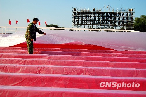 9月28日,北京天安门城楼前临时观礼台安装完毕,工人正在加铺防雨的塑料布。据城楼前的工人介绍,铺上防雨塑料布主要是为了防止30日当天下雨把红地毯淋湿。中新社发 许康平 摄