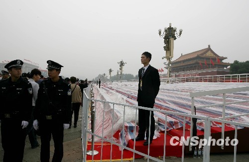 9月29日,北京天空朦胧,但天安门广场民众迎接国庆六十周年的热烈气氛浓郁。图为天安门广场庆祝中华人民共和国六十周年阅兵的准备工作已基本完成,新搭建的巨大观礼台已经铺好了红地毯,众多警卫人员在周围巡逻守卫。中新社发 王丽南 摄