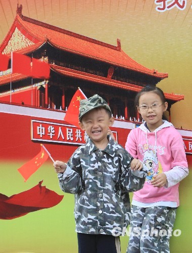 2009年10月1日,中华人民共和国成立60周年庆祝大会开幕前,众多民众一早赶往长安街沿线,希望亲眼目睹国庆庆典盛况。图为北京街头的两位小朋友手挥国旗迎国庆。中新社发 汤彦俊 摄