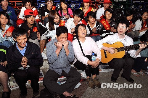 10月11日晚,在盲人节来临前夕,福州市盲人协会和青年志愿团队等在福州北江滨举办“携手共建和谐家园”的联欢活动。盲人朋友在志愿者帮助下畅游北江滨,还表演了碗乐、吉它演奏、笛子吹奏等。中新社发 张丽君 摄