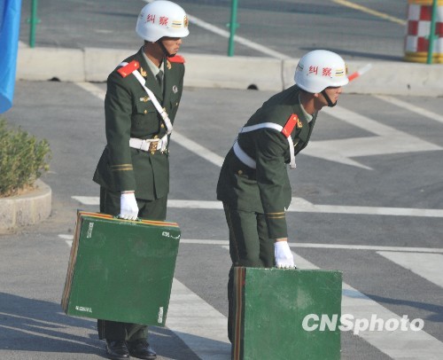 10月16日,十一届全运会在济南开幕,武装警察的纠察队在交通要道准备好紧急阻止的“杀手锏”装备。中新社发 贾国荣 摄
