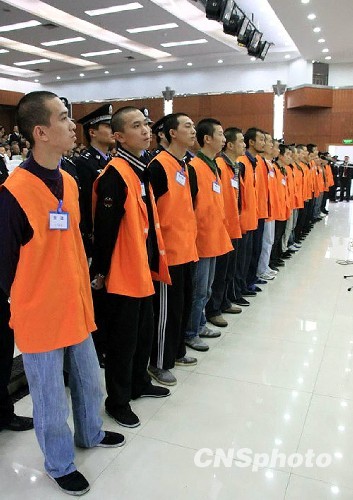 10月19日上午,重庆万州区张波、张涛涉黑团伙案在重庆市第二中级人民法院开庭审理。出庭的23名被告人面临涉及7项犯罪罪名的指控。据了解,该案的黑老大张波、张涛出生于1986年3月30日,年龄只有23岁,是一对双胞胎兄弟,系重庆市涉黑系列案件中年龄最小的黑老大。其余21名涉黑团伙成员,大多数骨干成员都是80后,最小的被告张成超出生于1989年8月1日,被捕时才19岁。该案系重庆市检察院挂牌督办的重大案件,重庆市人民检察院第二分院指派“市十佳公诉人”陈庆萍出庭支持公诉,起诉书长达1万余字。30多名人大代表、政协委员和司法监督员受邀旁听庭审。中新社发 高发轩 摄