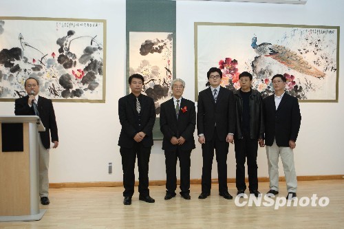 10月20日,中国画大师齐白石传人、著名花鸟画家杨吉魁教授(左三)在纽约举办“都市与自然的对语”大型画展,吸引众多纽约爱画人及名流前来观展,这是杨吉魁时隔八年第二次到美国举办画展。中新社发 魏晞 摄